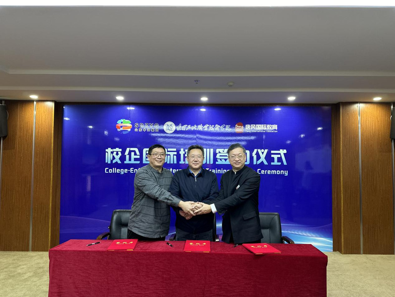 于忠党与王现洪和李劲松共同签署《校企国际培训协议》。