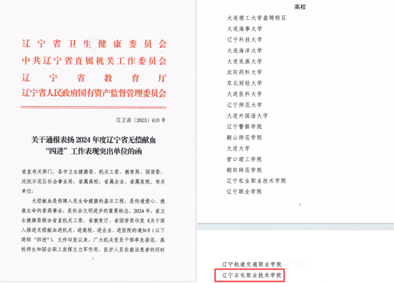 近日,辽宁省卫生健康委员会、省直机关工委、省教育厅、省国资委联合通报,对2024年度全省无偿献血“四进”工作表现突出的单位予以表彰,我校凭借在无偿献血工作中的扎实举措、显著成效和广泛影响力,成功入选,荣获“表现突出单位”称号。