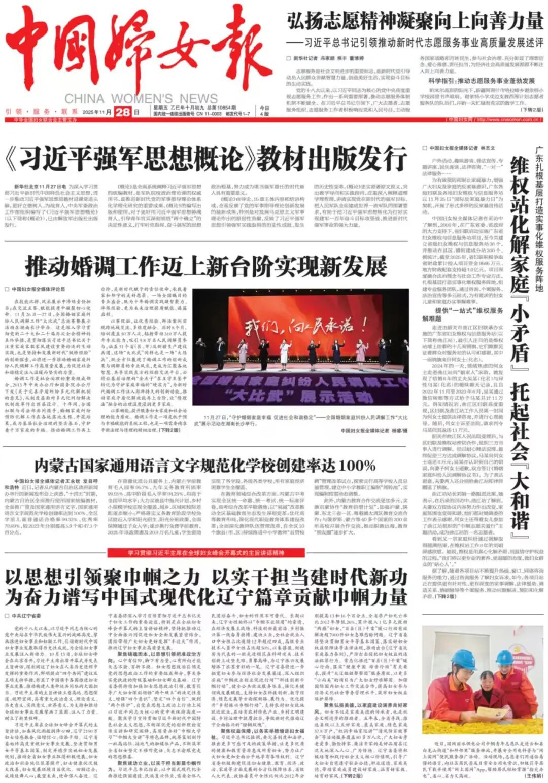 聚焦权益保障,以务实举措增进妇女福祉。习近平总书记强调,要完善制度和法律,推出更多可感可及的政策举措,让更多优质的健康和教育资源惠及所有妇女,努力让广大妇女更加全面公平地享有各项权利。辽宁省委积极构建促进妇女健康、教育、经济、政治、家庭等方面发展的全方位保障体系,省级人大代表、政协委员中女性比例比2012年分别提高13和16个百分点,全省孕产妇死亡率比2012年降低26%,累计投入1亿多元救助“两癌”妇女,“百县(区)千案”暖心行动有效解决超7000件妇女急难愁盼问题。辽宁省委将坚决贯彻男女平等基本国策,落实好妇女权益保障法等法律法规,推动出台《辽宁省反家庭暴力条例》,严厉打击侵犯妇女权益的违法犯罪行为。常态化推进“百县(区)千案”暖心行动,落实“健康中国 母亲行动”有关要求,提升“大辽姐姐帮帮团”服务质效,以更多“小而美”的项目为广大妇女纾难解困。加强国际国内妇女工作交流合作,提高妇女参与经济文化社会事务管理水平,筑牢妇女权益保护屏障。