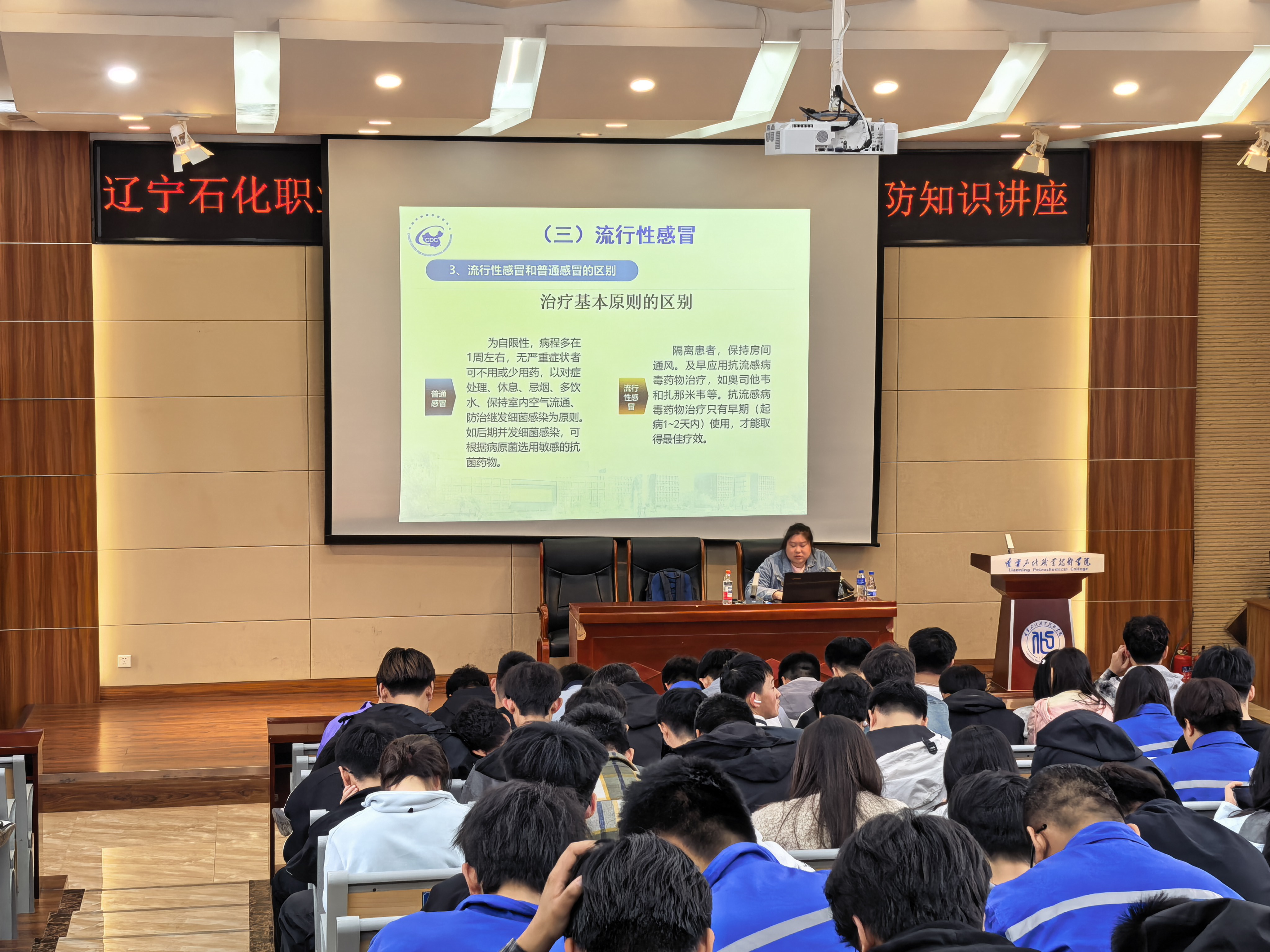 讲座特别邀请锦州市古塔区疾病预防控制中心传染病科段卓科长担任主讲。她围绕春季常见的结核病、新冠病毒感染、流行性感冒、麻疹、诺如病毒感染及水痘六种传染病,详细讲解了各类疾病的病原特点、传播途径与预防措施。讲座课件图文并茂、内容通俗易懂,既引导师生养成良好卫生习惯,也教授了科学规范的个人防护方法。
