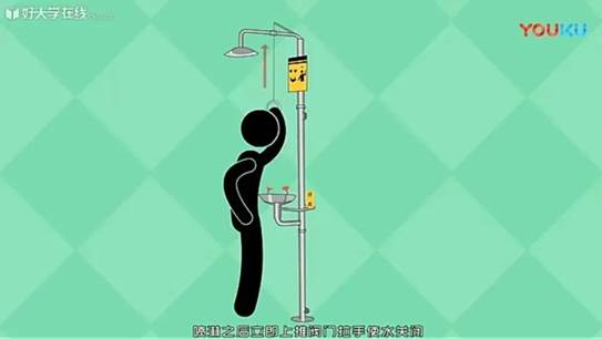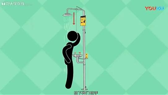 紧急喷淋器:当大量化学品溅到身上的时候,可先用紧急喷淋器进行全身喷淋。