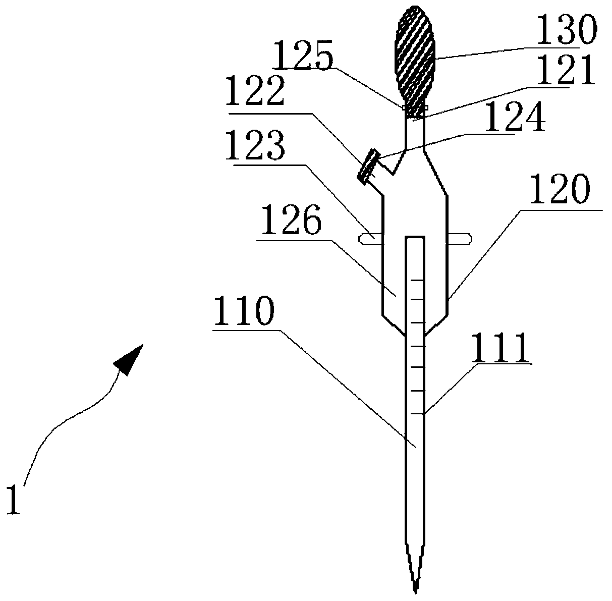 本实用新型公开了一种定量滴管。包括:定量管,其内部设有具有指定容积的通腔,用于定量量取液体;溢液管,其套设在定量管的上部与定量管外壁连接,在定量管与溢液管之间形成用于存储液体的溢液腔,在溢液管的顶部设有用于与胶头连接的第一开口;以及胶头,其设置在溢液管的第一开口处,其用于提供负压,以便将液体吸入定量滴管内。本实用新型的有益效果是:设有定量管,能够精确的量取液体药品;设有溢液管,能够将多吸取的药品存储在溢液腔内,防止药品进入胶头内;在溢流管上设有第二开口,可以将多吸取的药品倒出。