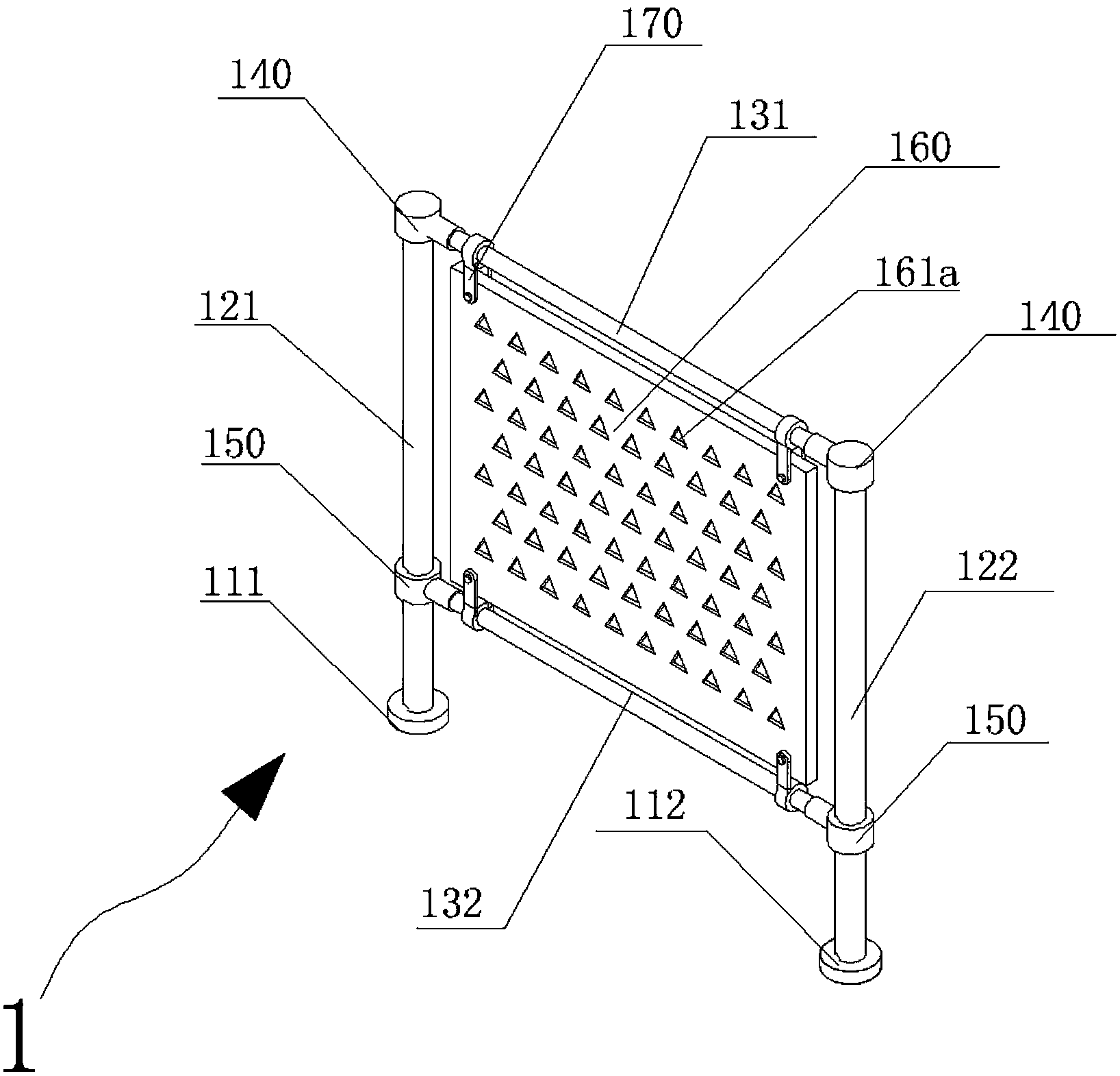 本实用新型公开了一种具有吸音降噪功能的隔离护栏。包括:隔离护栏本体,其上部设有隔音板;所述隔音板包括;基板层;吸音层,其设置在基板层的上方,用于吸收噪音;吸音垫板,其设置在所述吸音层的上方,用于进一步吸收噪音;其中,在所述吸音垫板上设有多个交错设置的吸音孔,所述吸音孔呈三角形。本实用新型的有益效果是:设有隔音板,所述隔音板由多个层结构组成,能够有效地降低噪音;设有横杆锁定机构,能够实现横杆的快速拆装;所述隔音孔呈三角形,相较现有的圆形隔音孔具有更改的吸收噪音的功能。