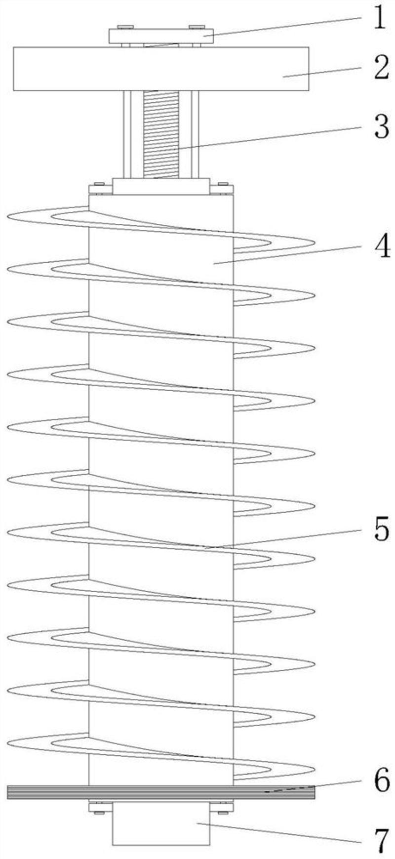本实用新型公开了属于清洁装置技术领域,一种换热管内部清洁装置,包括转动横杆,所述转动横杆的内部通过轴承转动连接有转动螺杆,所述转动螺杆的上方连接有调节转板,所述转动螺杆的外侧啮合连接有安装柱,所述安装柱的内部且对应转动螺杆的位置处开设有调节螺槽,所述转动横杆的下方且位于转动螺杆的两侧对称连接有限位导杆,本实用新型通过设置调节转板、转动螺杆、安装柱、限位导杆和限位导槽,在这些结构的相互配合下,实现了该装置的长度便于调节的功能,使该装置可适用于不同长度的换热管,并且在调节完成后便于对调节转板进行固定,从而可有效保证后续清洁操作的顺利进行。