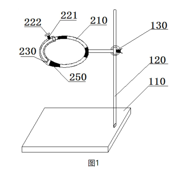 本实用新型公开了一种可调节实验室用铁架台,包括:第一管,其截面为环形结构,所述第一管为半圆形;第二管,其截面为圆形结构,所述第二管的一端与所述第一管一端固定连接,另一端设置在所述第一管的另一端内;定位机构,其设置在所述第一管上,能够将所述第一管和所述第二管打开或锁紧定位;连接杆,其一端连接所述第二管;支撑机构,其水平设置在试验台上,所述连接杆的可移动连接所述支撑机构上;其中,所述第一管和所述第二管组成可调节铁圈,通过所述第一管和所述第二管的配合,调节铁圈的直径。本实用新型提供的可调节实验室用铁架台,通过第二管与第一管的配合,能够调节铁圈直径,改变铁圈型号,适用于不同实验,使用方便,节省资源。