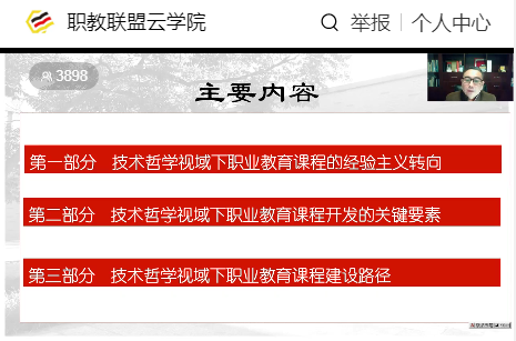 此次课程由浙江师范大学现代职业教育研究院副院长张棉好专家主讲,主题为“技术哲学视域下职业教育课程的经验主义转向”。