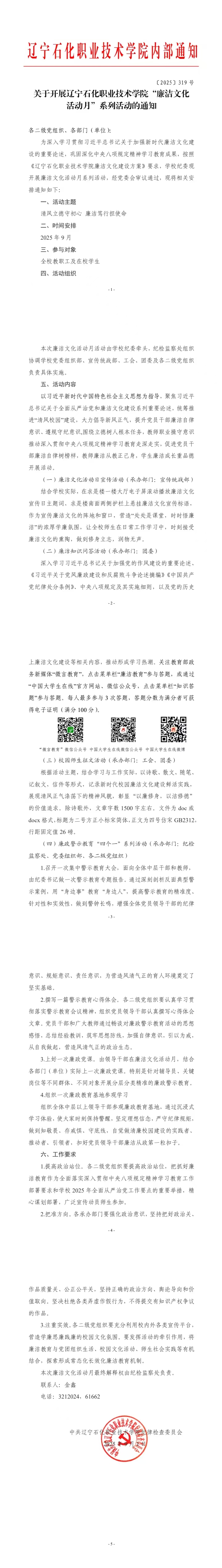 关于开展辽宁石化职业技术学院“廉洁文化活动月”系列活动的通知