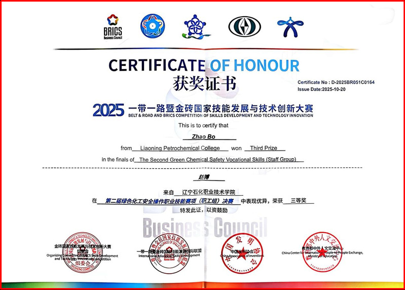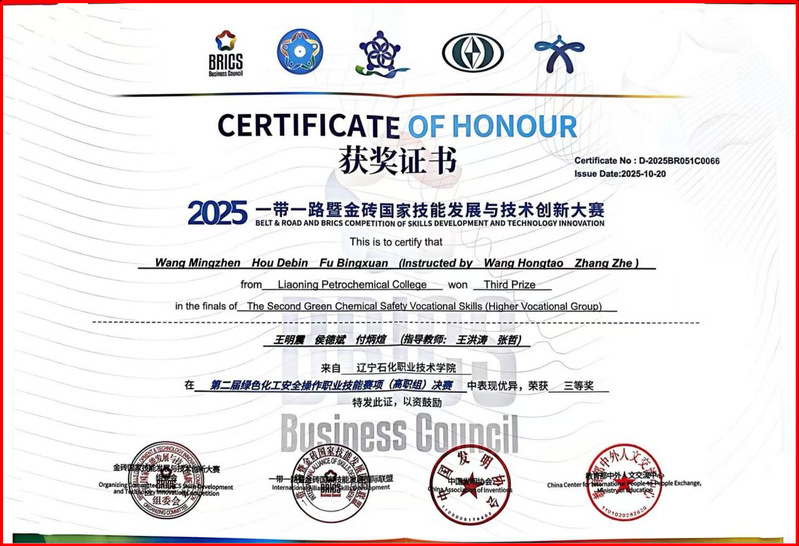 10月20日,2025一带一路暨金砖国家技能发展与技术创新大赛第二届绿色化工安全操作职业技能赛项在广西工业职业技术学院顺利落下帷幕。来自全国41所高职院校的123名学生选手,53名职工选手参与奖项角逐。由张哲、王洪涛老师指导的王明震、侯德斌、付炳煊参加学生组竞赛,赵博老师参加职工组竞赛,两支参赛队均取得了三等奖的好成绩。