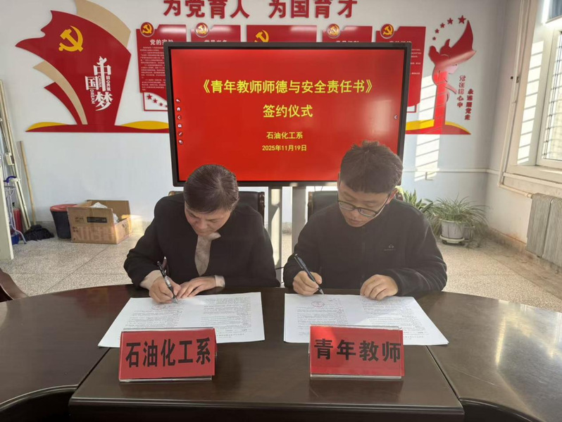 启动会后,系部与青年教师进行《石油化工系青年教师师德与安全责任书》签约,旨在明确青年教师在师德师风与安全责任方面的基本要求与行为规范,共同营造风清气正、安全稳定的育人环境。