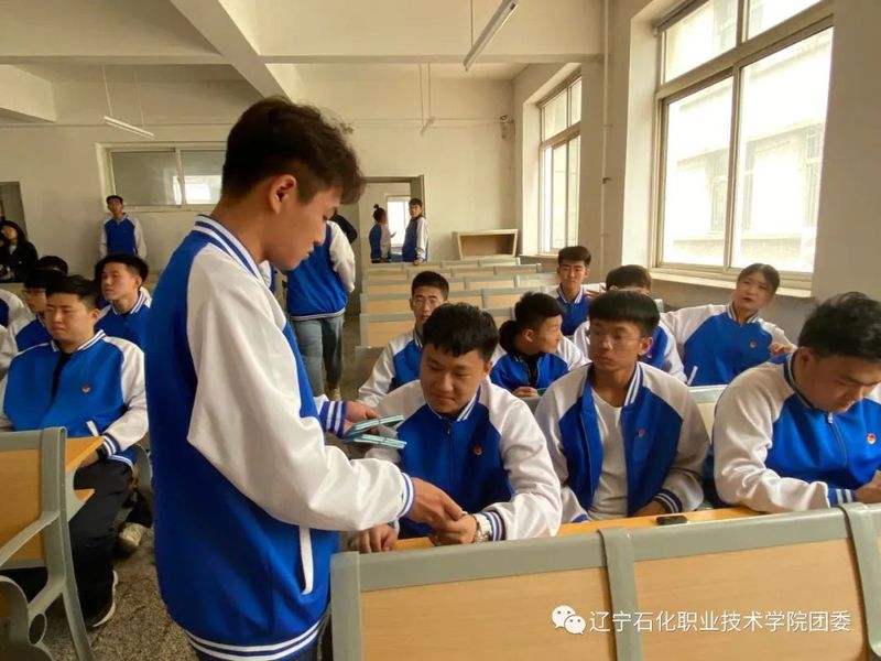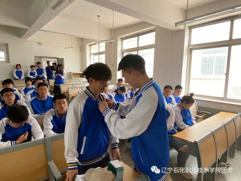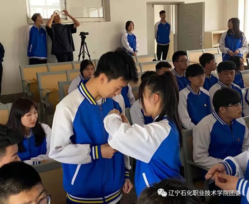 院团委学生干部给新团员们颁发团员证,佩戴团徽