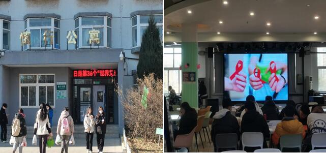 后勤服务与管理中心在教学楼、宿舍楼、食堂等醒目位置张贴了宣传海报;利用餐厅大屏幕滚动播放2023年“世界艾滋病日”主题宣传片;在LED电子屏上播放防艾宣传标语,在校园内营造全员参与的防艾氛围。