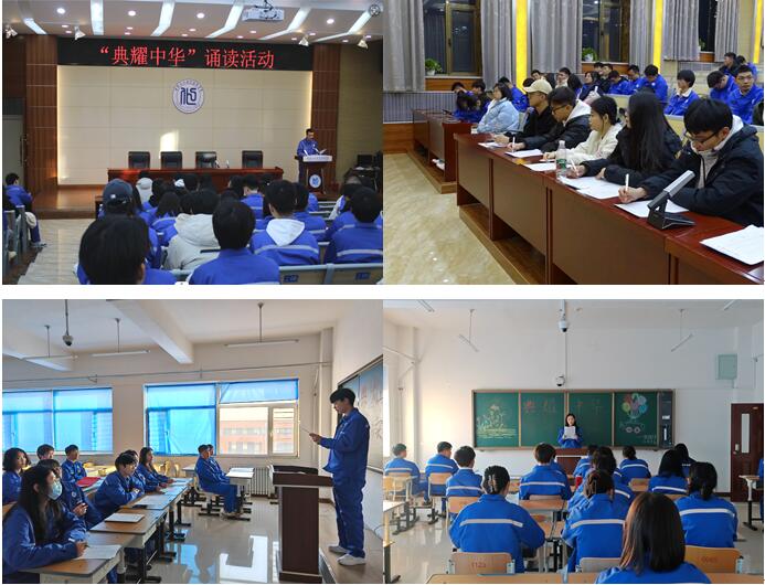 为深入贯彻落实党的二十大精神,学习贯彻习近平新时代中国特色社会主义思想,传承发展中华优秀传统文化,12月4日,学院团委按照《国家语委关于深入实施“典耀中华”主题读书行动的指导意见》(国语【2023】1号)的通知要求,分别在古塔校区勤学楼报告厅和滨海校区求善楼合班四开展“典耀中华”诵读活动。学院团委干事徐铭悦老师、院系两级学生干部以及各系学生代表共200余人参加活动。