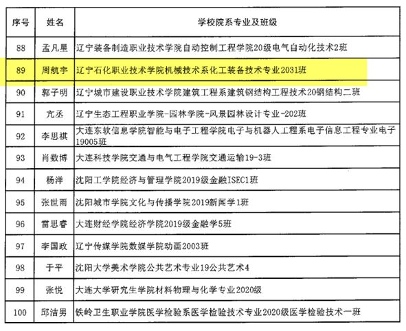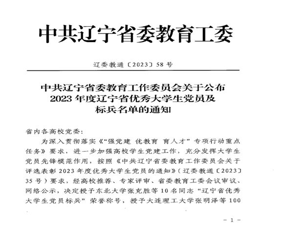 近日,中共辽宁省委教育工委发布了《关于公布2023年度辽宁省优秀大学生党员及标兵名单的通知》,学院机械技术系化机2031班周航宇同学名列其中,荣获“2023年辽宁省优秀大学生党员”荣誉称号。