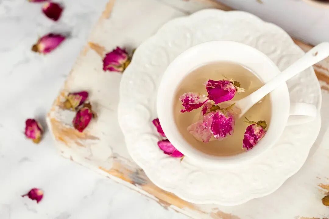 功效:玫瑰花具有疏肝解郁、活血调经的作用,适合情绪低落、肝气郁结者饮用。