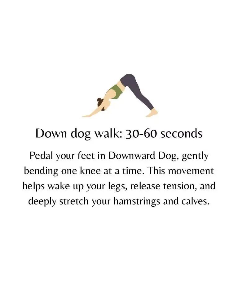 在下犬式中用脚踩踏,一次轻轻弯曲一只膝盖。这个动作有助于唤醒你的双腿,释放紧张感,深度伸展你的腘绳肌和小腿。
