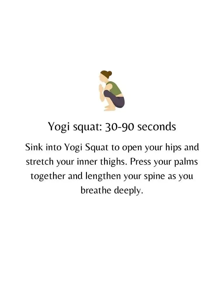 保持在瑜伽深蹲中,打开髋部,伸展大腿内侧。深呼吸时,双手合十,伸展脊椎。