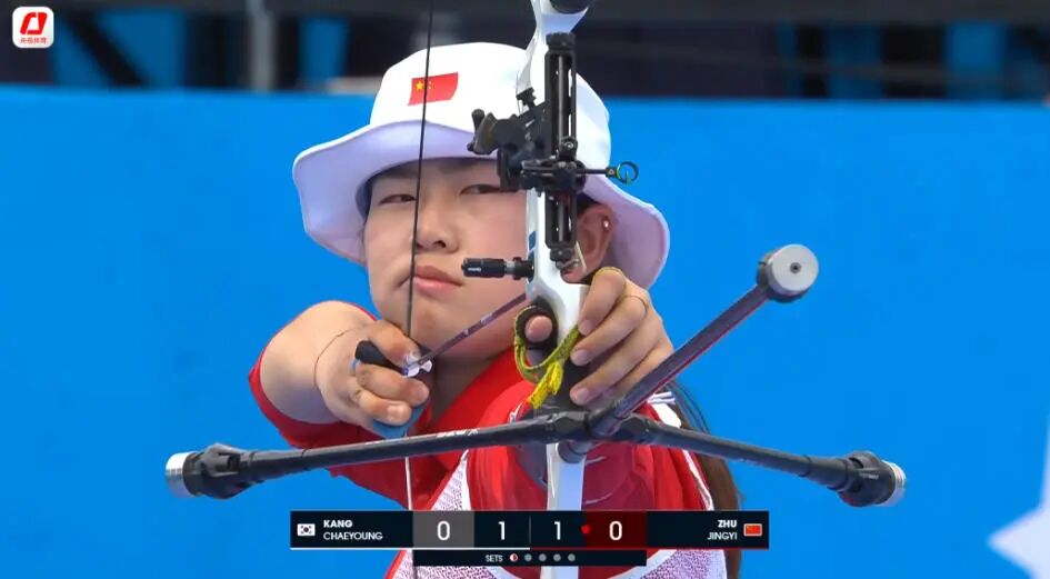 反曲弓女子个人金牌赛挑战韩国名将姜彩瑛,率先发射的朱静怡给对手制造了不小的麻烦。首局两人都打出了29环,大比分1比1平分秋色,第二局朱静怡以28比29落后1环,大比分来到1比3,接下来一局,两名选手都再次打出了29环的出色表现,将比分改写为2比4。随着比分的上升,姜彩瑛已经离胜利越来越近,她只要在下一局赢过朱静怡,就能收获胜利,但是朱静怡显然没有轻易给对手这样的机会,压力之下,朱静怡敢打敢拼,打出了3个10环,姜彩瑛也毫不示弱,回敬3个10环,比分来到3比5。最后一局仍旧是朱静怡先发,她们在前两支箭都打出了19环,第三支箭朱静怡打出9环,紧接着发射的姜彩瑛命中10环,后者从而以29环比28环再得2分,以大比分7比3拿下胜利。朱静怡摘得银牌,韩国选手安山收获季军。在这场精彩的金牌赛过后,姜彩瑛竖起大拇指称赞了小将朱静怡的发挥,朱静怡也在赛后采访表示:“这是我第一次和姜彩瑛交手,她的出色表现在我的意料之中,她是一位很不错的射手。”