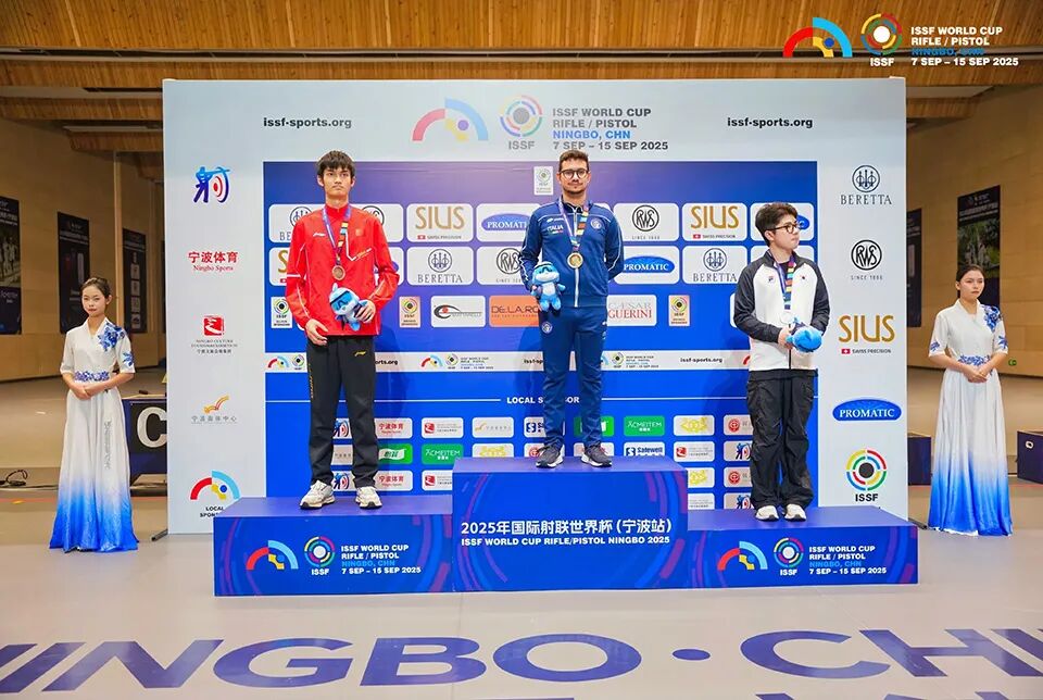 9月11日,2025年国际射联射击世界杯宁波站决出男子10米气步枪金牌,意大利选手达尼洛·丹尼斯·索拉佐以255.0环夺得金牌并打破了此前由中国选手盛李豪保持的男子10米气步枪决赛世界纪录。盛李豪摘得银牌,收获今年第5枚世界杯奖牌。