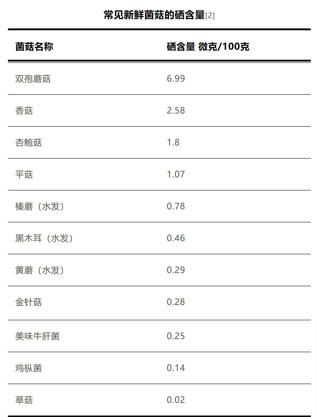 口蘑是硒的良好食物来源,每 100 克新鲜口蘑的硒含量为 6.99 微克,几乎是常见菌菇中的第一名。