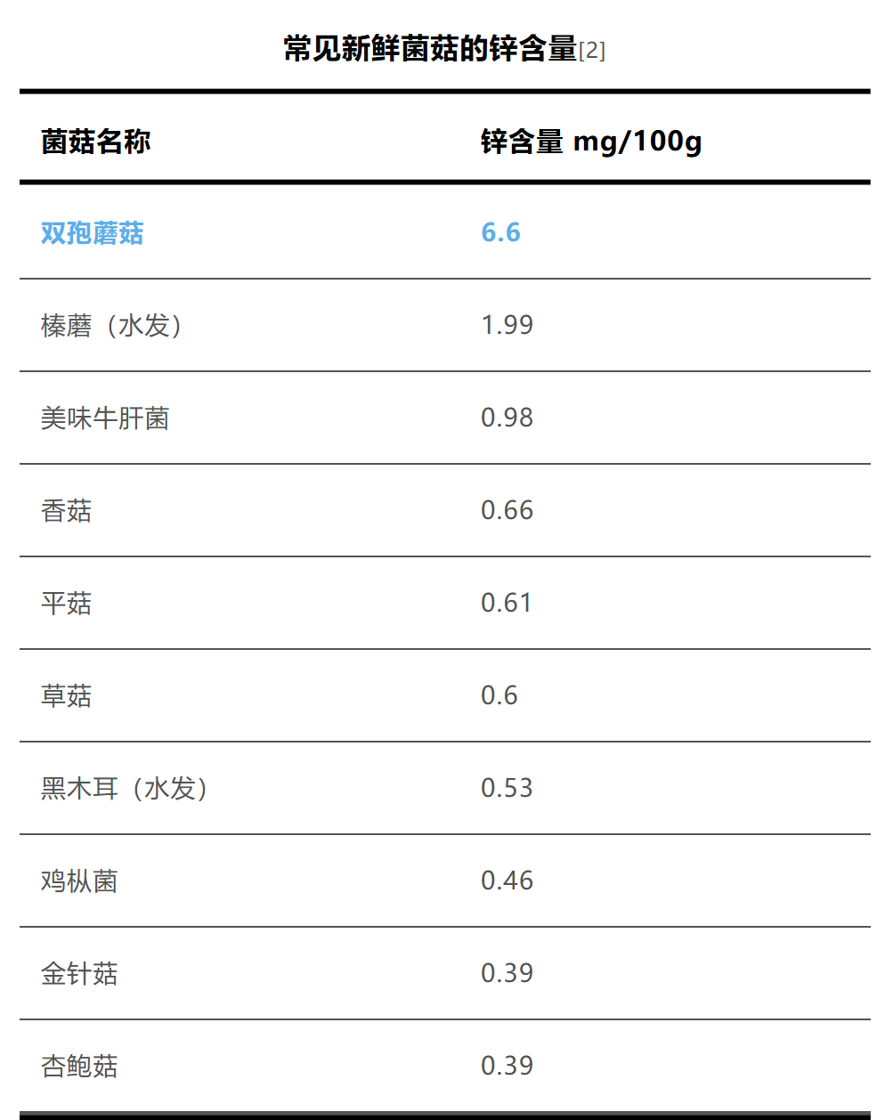每 100 克新鲜口蘑的锌含量高达 6.6 毫克,这在常见新鲜菌菇中几乎是第一名!