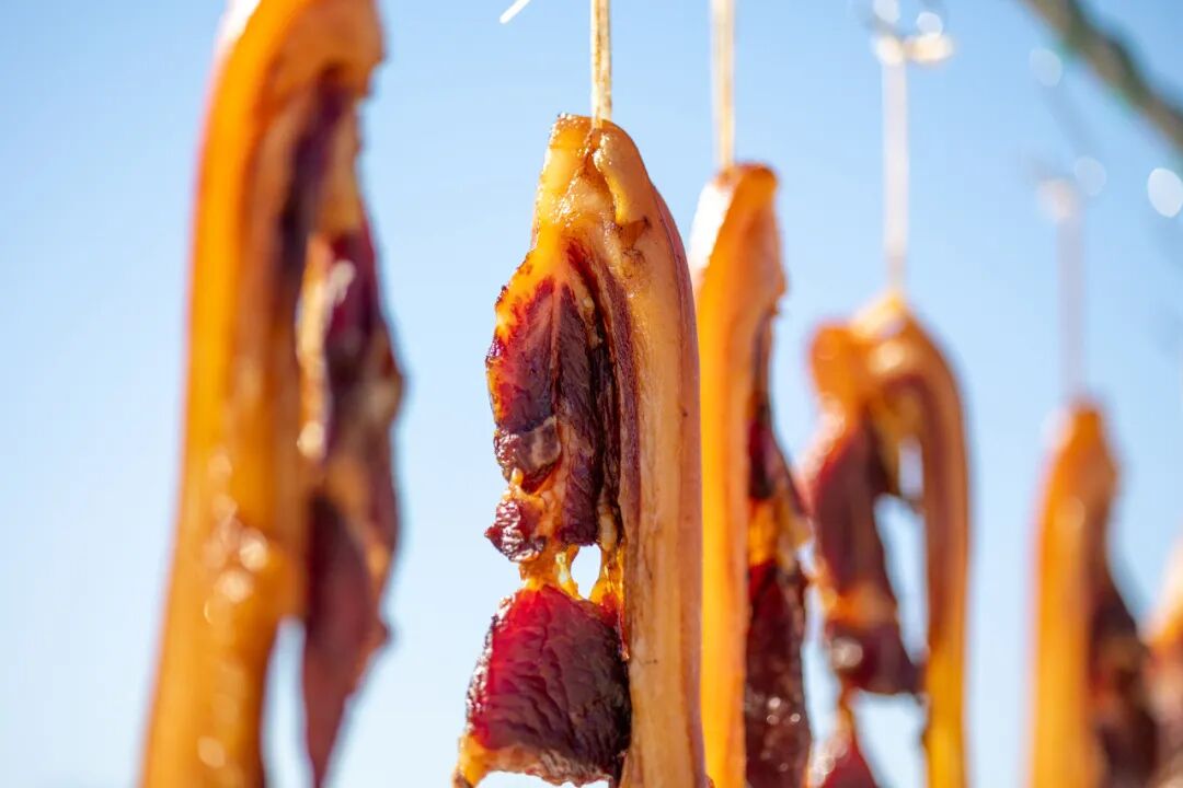 在我国很多地方,每到大雪节气,家里的老人就会翻着日历,忙活着准备腌制腊肉。从市场上买来肥瘦相间的五花肉,用炒熟的花椒和盐细细揉搓,经过繁杂的工序后,在阳台或屋檐下高高挂起。冷冽的空气是天然冰箱,干燥的气候能加速肉表面水分的蒸发,实现自然风干,腊肉也就有了更加紧致的口感并延长了保质期,时光和风霜就这样被慢慢揉进肉的脉络。
