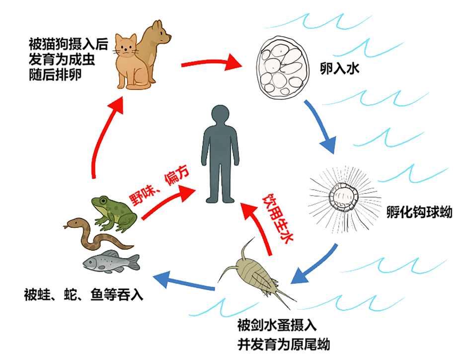如果人们不小心饮用含有原尾蚴或裂头蚴的生水、或食用未煮熟的蛙、蛇肉,甚至用生蛙肉敷伤口,这些幼虫便可能进入人体。其中,原尾蚴会在人体内继续发育,最终变成裂头蚴。裂头蚴虽不能在人体内发育为成虫,但可长期存活(最高可达30年),并可能迁移到皮下组织、眼睛、大脑等重要部位,造成严重健康问题。
