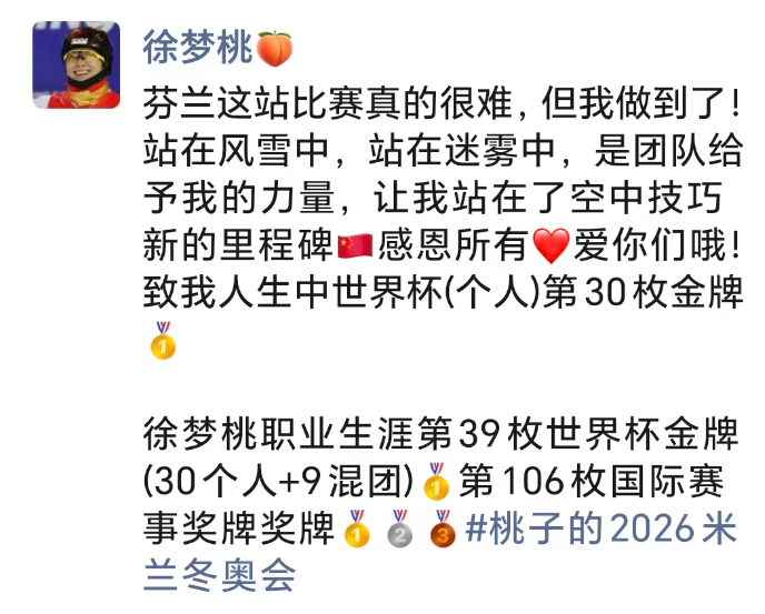 赛后,她在社交媒体分享道:“芬兰这站比赛真的很难,但我做到了!站在风雪中,站在迷雾中,是团队给予我的力量,让我站在了空中技巧新的里程碑。”