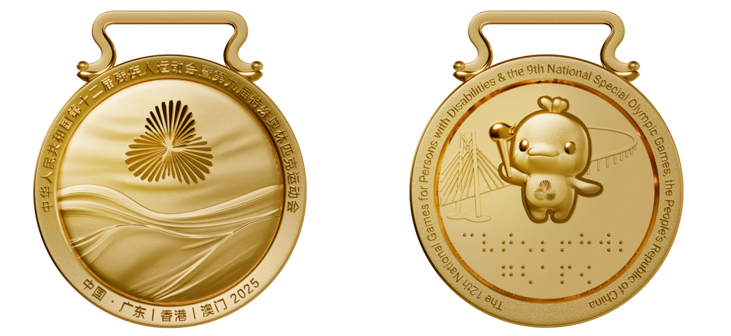 奖牌背面,中华白海豚浮雕,吉祥物高擎火炬,象征奥林匹克精神生生不息、代代相传。浮雕下方创新性地应用了盲文(第一行“残特奥会”,第二行分别为“金牌”“银牌”“铜牌”),体现了对参赛者的用心与尊重,让视障运动员能够亲手触摸这份沉甸甸的荣耀,真切感受属于他们的荣光。背景上的港珠澳大桥是圆梦桥、同心桥、自信桥、复兴桥,体现了逢山开路、遇水架桥的奋斗精神,体现了我国综合国力与自主创新能力,体现了勇创世界一流的民族志气,传递着同心携手、融合发展的图景。“同心暖”奖牌不仅传递着社会对残疾人的关怀和尊重,更将见证十二月赛场上的拼搏与辉煌、残疾人运动员巅峰时刻的加冕,激励残疾人运动员超越自我、勇创佳绩。